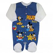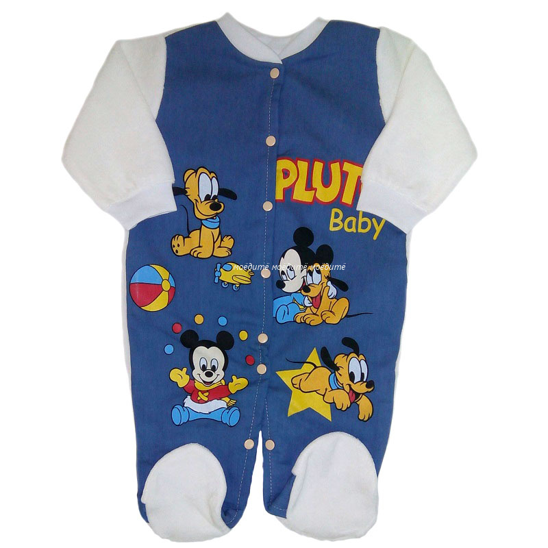 Комбинезон без воротничка, с закрытыми ножками, с рукавами на манжете. Сзади комбинезон выполнен из велюра белого цвета, спереди из джинса и украшен героями из мультфильмов.