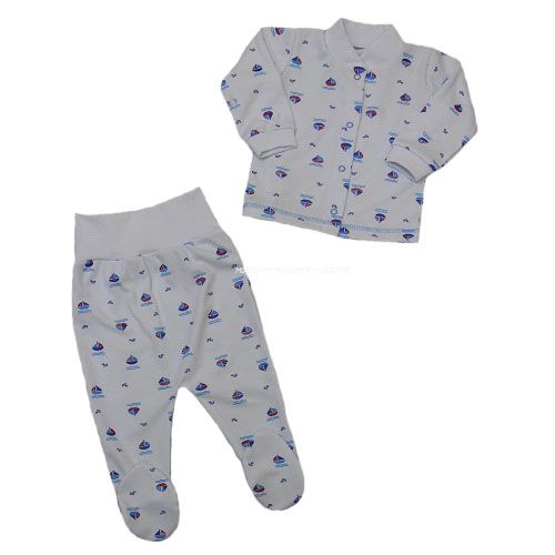 Комплект состоит из кофточки с воротничком, спереди на кнопочках и ползунков на широкой резинке.